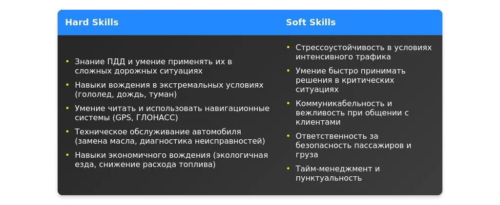 После: "Управление автомобилем, знание ПДД, опыт работы с клиентами, стрессоустойчивость."