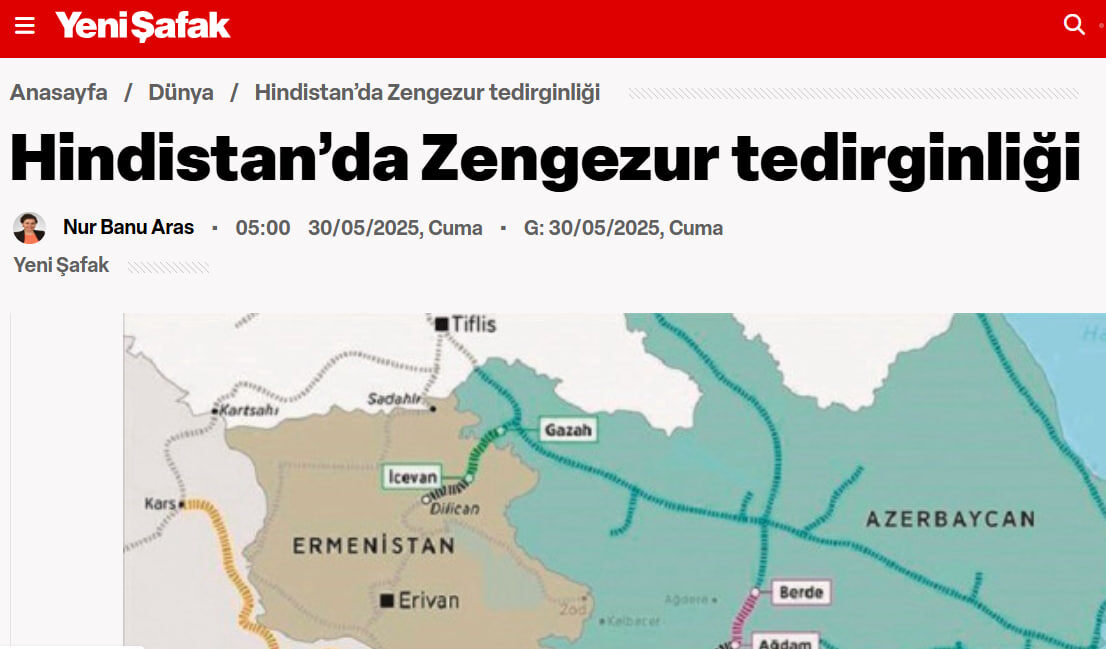 Провластная турецкая газета Yeni Şafak опубликовала статью под заголовком «Зангезурская тревога в Индии», в которой говорится об обеспокоенности, зафиксированной в индийских СМИ в связи с перспективой открытия «Зангезурского коридора». В публикации подчеркивается, что Турция рассматривает данный коридор как стратегическую инициативу, направленную на физическую интеграцию всего тюркского мира. Согласно дипломатическим источникам, проект «Зангезурского коридора» впервые предоставит тюркским странам «позвоночный маршрут» через Баку, Нахичевань и Зангезур(армянский регион Сюник — прим. ред.). В статье подчеркивается, что это не просто транспортный проект, а инициатива с важным геополитическим значением. Yeni Şafak отмечает, что ряду стран, в том числе Индии и Франции, проект вызывает обеспокоенность. Франция, по данным источников, якобы выступает в роли «участника мирного процесса», однако в действительности преследует цель «перерезать тюркскую связь». В этом контексте действия Парижа расс