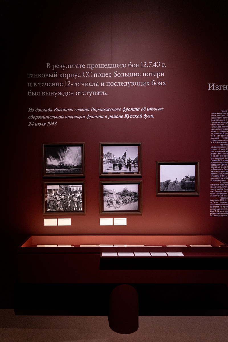 Здесь же можно увидеть на интерактивной панели чек с набросками слов Гимна СССР, наградной лист разведчика Николая Кузнецова и лётчика Алексея Маресьева, сообщение особой формы «Фашистско-немецкие мерзавцы», опубликованное в газете «Правда», с личной правкой Сталина, школьный дневник Зои Космодемьянской, Знамя Победы, водружённое над Рейхстагом, текст речи В. М. Молотова, написанный им лично карандашом… «Эта экспозиция, безусловно, уникальна, потому что впервые в таком количестве и в такой полноте на одной площадке представлены основные документы и музейные предметы по истории Великой Отечественной войны», — подчёркивает Андрей Юрасов.