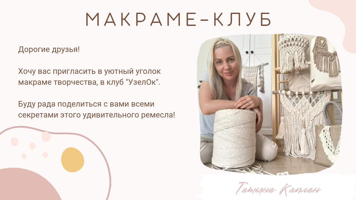 Дорогие друзья! Меня зовут Татьяна Каплан. Хочу вас пригласить в уютный уголок макраме творчества под названием «УзелОк». Буду счастлива поделиться с вами всеми секретами этого удивительного ремесла. Благодаря тренду на handmade и экологичность, спрос на изделия в технике макраме растёт. Освоив эту технику, вы сможете не только создавать шедевры для себя, но и превратить свое увлечение в бизнес – многие успешные мастера уже зарабатывают на продаже своих работ. Курс "Современное макраме для начинающих" – ваш первый шаг в мир плетения узлов. Программа состоит из 3 тематических блоков, которые помогут вам освоить основы и подготовиться к созданию своих первых работ. Эксклюзивные Мастер-классы – 6 увлекательных видео-уроков сразу после подключения и еще один новый каждый месяц. Вы будете постоянно развиваться и создавать новые шедевры! Все уроки подробные и будут понятны даже новичкам. Доступ в закрытый чат "УзелОк" – наше творческое сообщество, где вы сможете: Эксклюзивный контент – спе