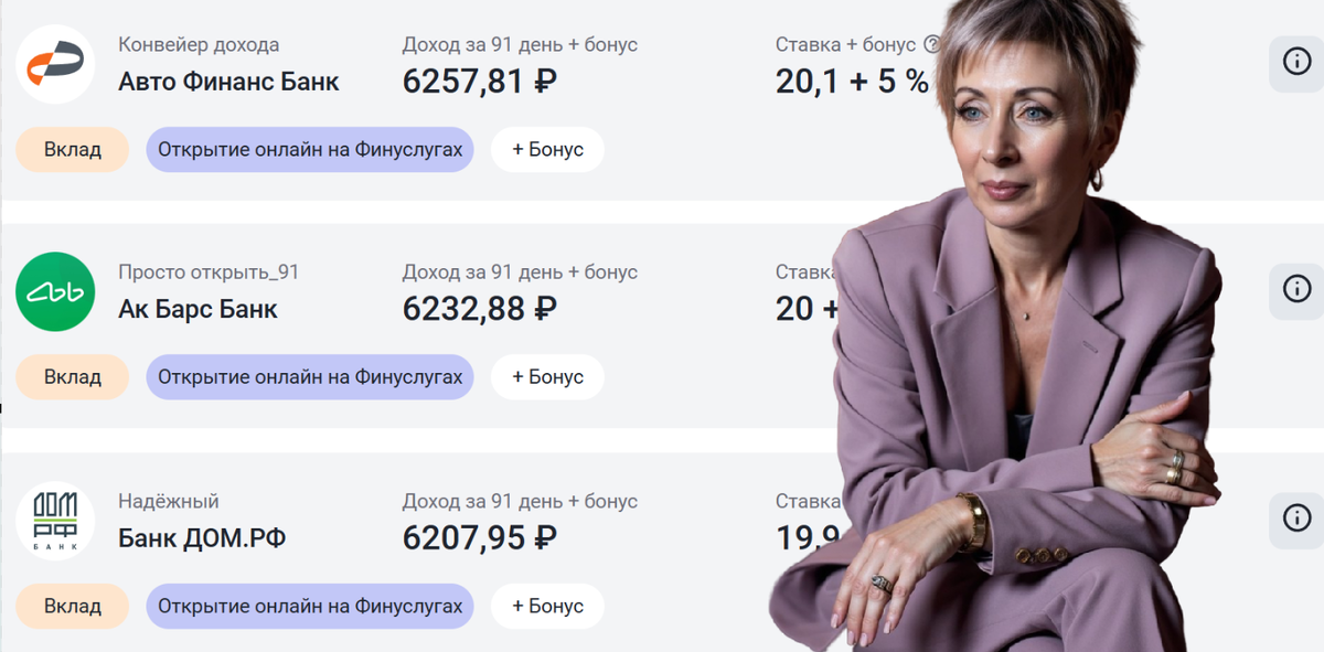 Много банков, много предложений, разобраться не так-то просто, правда? Нашла для вас 5 самых интересных на данный момент вкладов, с небольшим сроком и незаоблачной суммой, и рассказываю, сколько денег они вам принесут. Если вы увидели название и поняли, что в вашем городе каких-то банов нет, дочитайте до конца, и увидите, что это в общем-то не важно. Да! Если вы думаете открывать вклад, то поторопитесь, 6 июня опять пройдет заседание по ключевой ставке, и если вдруг ее опустят, проценты по вкладам сразу же пойдут резко вниз. Да даже если и не опустят... Как показывает опыт и сохранение ключевой ставки для банков — повод снижать свои собственные ставки. Предлагает 20,1% + еще 5% за открытие через платформу Финуслуги. Вообще все вклады, которые я сейчас рассматриваю, идут через Финуслуги, это получается ЗНАЧИТЕЛЬНО выгоднее, чем открывать напрямую в банке. Раньше там было довольно сложно регистрироваться, но сейчас все просто, и можно регистрироваться через Госуслуги, я так и сделала, эт