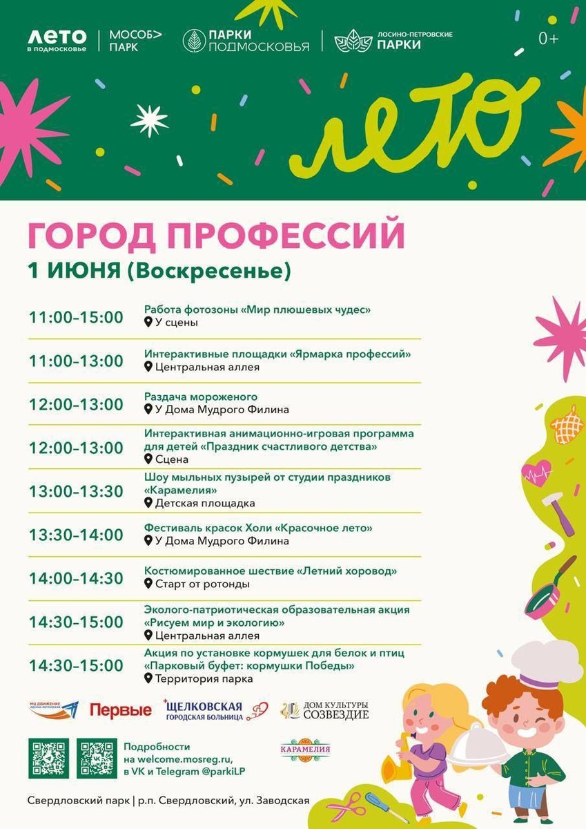 Первый день лета в нашем округе будет по-настоящему ярким. В парке пгт. Свердловский состоится праздничная программа «Город профессий», посвящённая Дню защиты детей. Для вас, дорогие жители, учреждения культуры подготовили насыщенные программы: - концерты, - конкурсы, - игры, - интерактивные программы, - мастер-классы и многое другое. 🍨И какой же праздник без вкусняшек и угощений? 1 июня в 12:00 в парках г.о. Лосино-Петровский маленьких гостей будет ждать вкусное летнее угощение — мороженое от команды губернатора Подмосковья Андрея Воробьёва. ❤️Дорогие жители! Не упустите возможность весело и интересно провести время вместе с детьми и насладиться атмосферой праздника. Сохраняйте афиши и приходите на мероприятия!