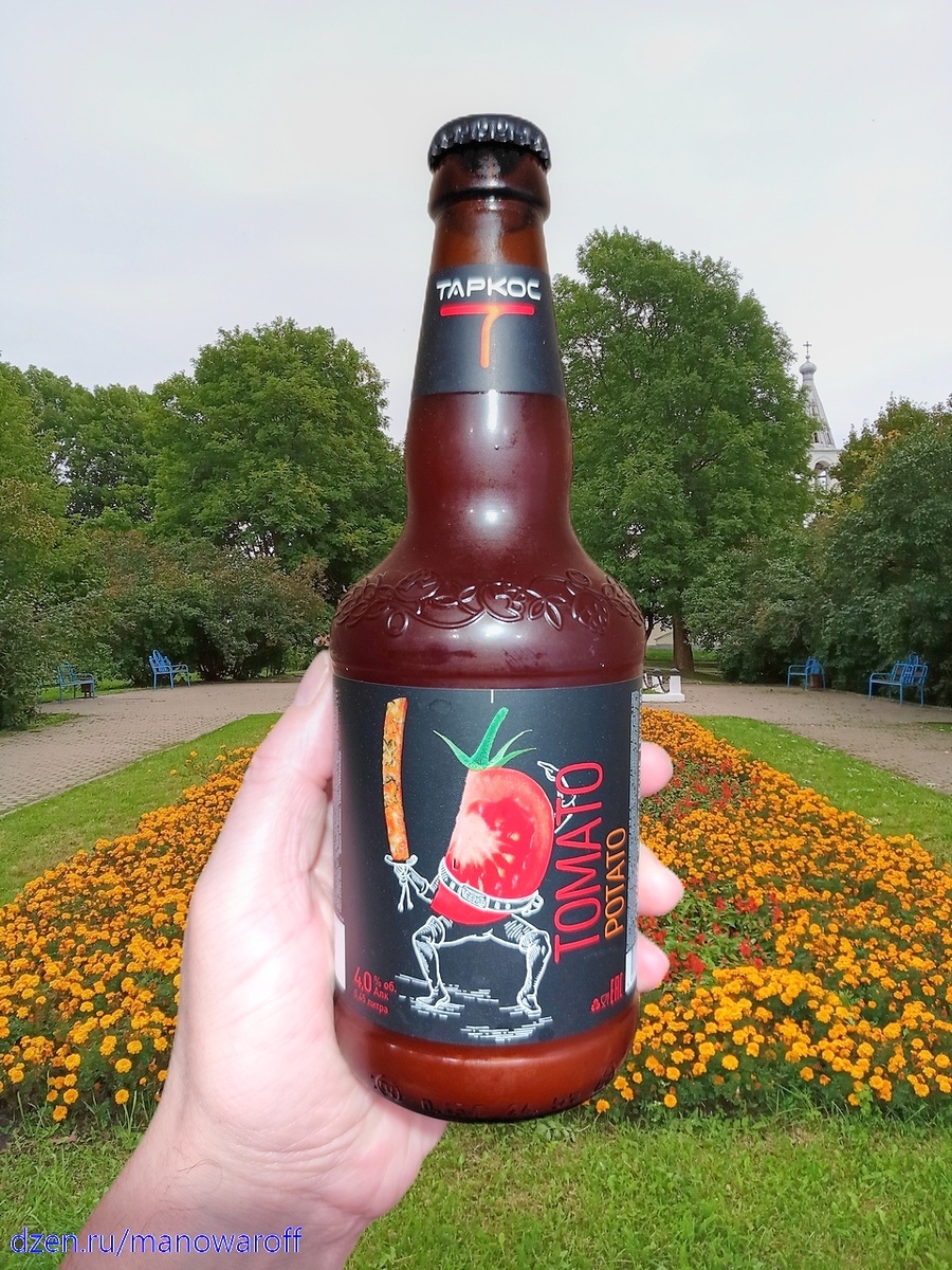 Насчет любимого я, конечно, шучу, но думаю, что Бацька заинтересовался бы напитком под названием Tomato Potato, который варит воронежская пивоварня "Таркос". Я, впрочем, тоже заинтересовался, ибо оригинальная Мотата мне нравилась, поэтому захотелось попробовать и картофельную версию. Появилась она, кстати, в июле прошлого года. Вот что о ней сообщает производитель: Tomato Potato — это пшеничное пиво с ярким томатным вкусом и ароматом молодого картофеля с укропом. С этими узнаваемыми летними нотами гармонируют лёгкая освежающая кислинка, ненавязчивая солёность и вкусовые акценты красного перца и чеснока. У меня бутылка датирована 16 марта сего года, а откупорил я ее 30 мая. Срок годности до 11 декабря. В составе присутствует томатная паста, морская соль, красный перец, сахар, лимонная кислота, кориандр и некие ароматизаторы. ТТХ: Пиво похоже на прилично разбавленный томатный сок. Небольшая пенка исчезла шустро. Пахнет томатами и... Вы знаете, продаются такие миксы специй, которые добав