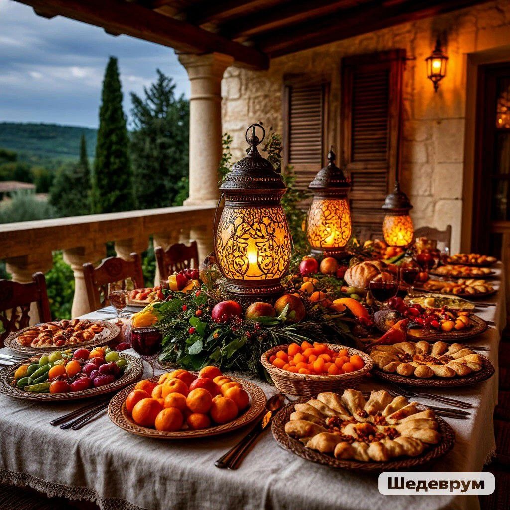 Здесь же, на террасе, были накрыты праздничные столы, щедро уставленные блюдами, полными овощей, фруктов, невиданных плодов — свежих, запеченных и засахаренных. Были здесь и блюда с круглыми белыми хлебами, усыпанными поджаристыми семечками и кувшины молодого вина, приготовленного к Золотому Полнолунию. Центр каждого стола украшал большой венок, внутри которого были расставлены низенькие люминарисовые лампы, прикрытые резными ставенками так, что свет их казался приглушенным и мягким. #цитата_Елизавета_Лаггар_Песни_Серебряных_струн #читаю_авторов@shulguna207 #ридеринг