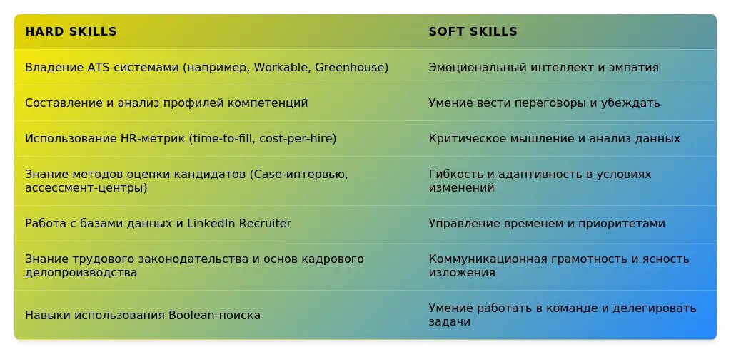 После адаптации: "Навыки проведения переговоров с кандидатами, знание психологических методов оценки, опыт работы с международными кандидатами." Акцент на переговоры и международный опыт.