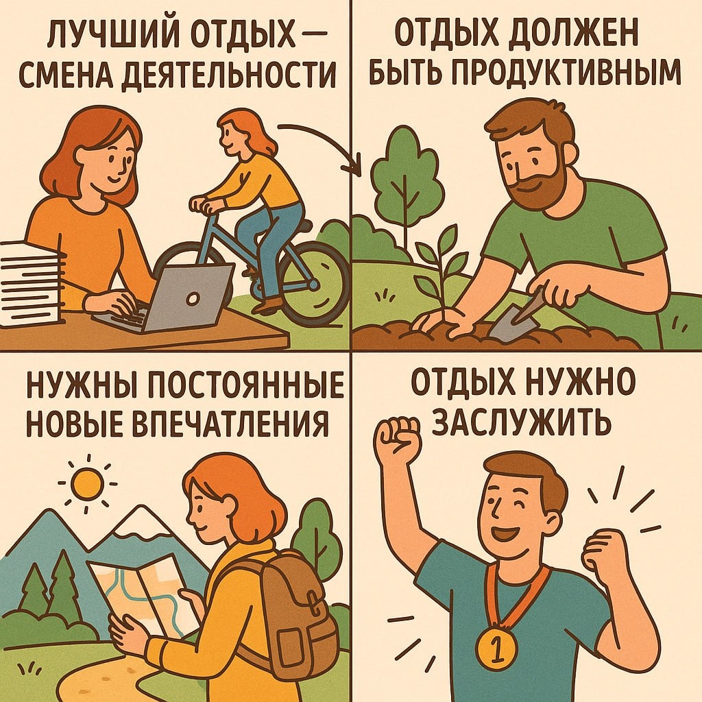 😌 О, отдых! В ролях: ⚡️ «Лучший отдых — смена деятельности» ⚡️«Отдых должен быть продуктивным» ⚡️ «Нужны постоянные новые впечатления» ⚡️ «Отдых нужно заслужить» Перед вами лучшие примеры мракобесия. Эти примеры и установки не только неэффективны, но и загоняют людей в стресс и выгорание. Тогда что такое отдых? Отдых — это комплексный процесс восстановления умственных, физических и эмоциональных сил организма. Он включает в себя: отсутствие деятельности, состояние психологического и физиологического покоя. С технической точки зрения — это снижение уровня кортизола, уменьшение частоты сердечных сокращений, усиление синтеза АТФ, когнитивное отсоединение от работы. 3 важных принципа отдыха: 6️⃣отсутствие ответственности за другого человека // когда во время отдыха приходится следить, помогать или отвечать за чьи-то действия, это не отдых, а дополнительная нагрузка 2️⃣ отсутствие конкуренции // если во время отдыха происходит постоянное сравнение с окружающими, стремление превзойти