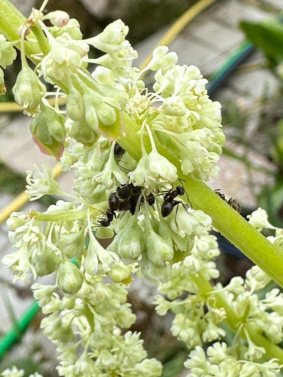 Мой своенравный айфон сегодня сподобился разрешить сделать некоторые макро-снимки с удовлетворительным разрешением. Спешу поделиться результатами, которые и сами по себе небезынтересны. Резкое потепление вызвало в саду шквал всевозможных событий. В том числе, и вспышки всяких-разных болезней/вредителей, увы. Тля, естественно. Кто-чего про нее еще не знает! Надоело/неинтересно рассказывать-жаловаться. И все равно, и тем не менее. Какой животрепещущий сюжет! Муравьи, расселяющие тлей. Очевидно, только затащили сюда нескольких жирненьких тлюшек, чтобы паслись и зародили колонию. Тлей-то всего – по пальцам одной руки можно было бы сосчитать, если бы я мог их разглядеть (они черненькие, как муравьи, и в самом центре происходящего). Муравьев-пастухов – больше. И как суетятся, как снуют вокруг ядрышка будущего тлиного стада! Дело, кстати сказать, происходит на огромном соцветии ревеня. И кстати сказать, на этом соцветии еще несколько таких точечных поселений. Поскольку тли – представители