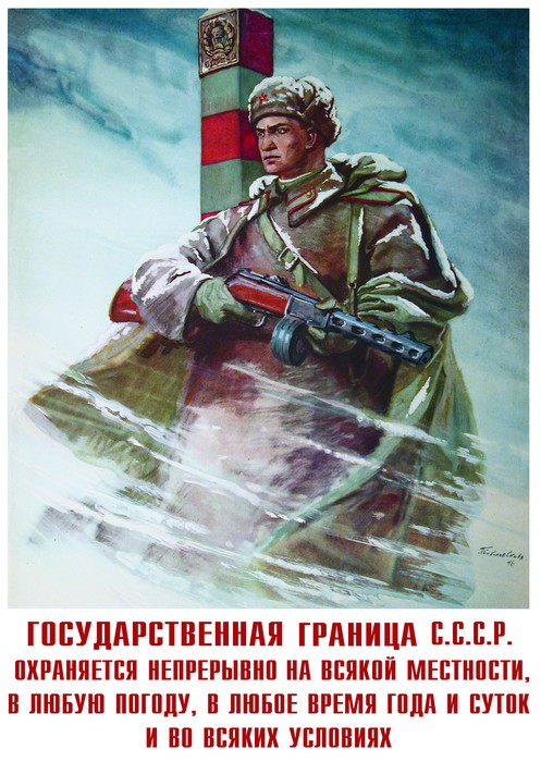 "...Рубеж - это два столба. Они стоят друг против друга, молчаливые и враждебные, олицетворяя собой два мира. Один выстроганный и отшлифованный, выкрашенный, как полицейская будка, в черно-белую краску. Наверху крепкими гвоздями приколочен одноглавый хищник... Через шесть шагов напротив - другой столб. Глубоко в землю врыт круглый тесаный дубовый столбище. На столбе литой железный щит, на нем молот и серп. Меж двумя мирами пролегла пропасть, хотя столбы врыты на ровной земле. Перейти эти шесть шагов нельзя человеку, не рискуя жизнью. Здесь граница. От Черного моря на тысячи километров до Крайнего Севера, к Ледовитому океану, выстроилась неподвижная цепь этих молчаливых часовых советских социалистических республик с великой эмблемой труда на железных щитах..."