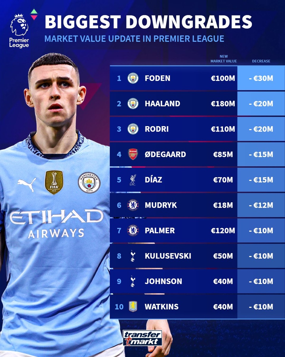 Transfermarkt последний раз в сезоне-2024/25 обновил трансферную стоимость футболистов английской Премьер-лиги. Хотя АПЛ все еще остается самой дорогой лигой мира, суммарно стоимость всех игроков английского первенства снизилась на 516,58 млн евро и теперь составляет 11,3 млрд евро. Самый заметный спад показали футболисты «Манчестер Сити». Трансферная стоимость Фила Фодена упала на 30 млн евро – больше, чем у любого другого игрока АПЛ. Эрлинг Холанд подешевел на 20 млн евро, покупателю придется выложить за норвежца 180 млн евро. Теперь в мире лишь один футболист, чья трансферная стоимость оценивается в 200 млн евро, – речь о Винисиусе. Игроки АПЛ, чья трансферная стоимость снизилась после майского обновления Transfermarkt Как и в марте, Александер Исак стал главным бенефициаром обновления Transfermarkt, стоимость звезды «Ньюкасла» возросла с 100 млн до 120 млн евро. Теперь швед входит в пятерку самых дорогих футболистов Премьер-лиги. Второй лучший результат показал Дин Хейсен, чья стои