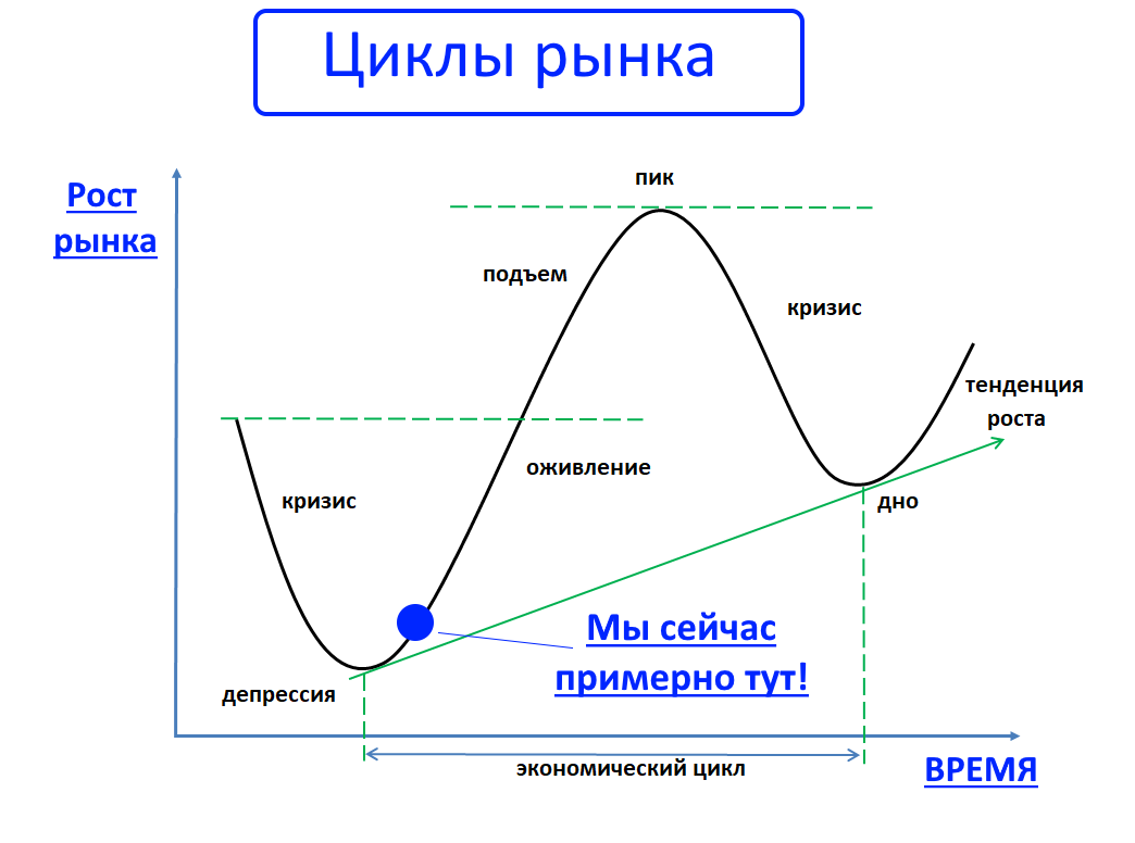 Я продолжаю инвестировать, потому что сейчас рынок находится в просадке, и это видно как по графику индекса Мосбиржи, так и по рыночным циклам. Исторически подобные периоды оказывались самыми удачными точками входа в акции.
