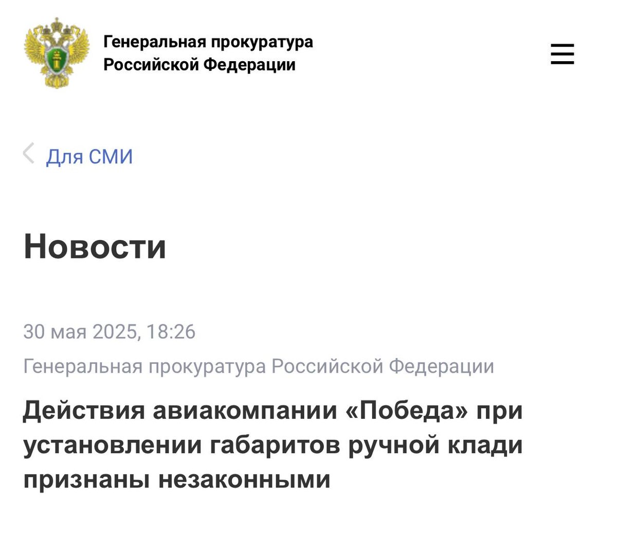 "Победа" незаконно ограничивала размеры ручной клади до 4 см, сообщили в Генпрокуратуре РФ. Пассажиры не могли провозить вещи, компания умышленно создала препятствия для бесплатного провоза. Также проверяли размеры предметов, не подлежащих ограничению (дамская сумка, цветы, кресло-коляска и др.). Заря | Новости - Подписаться