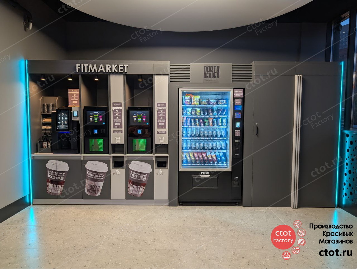 Здоровый образ жизни стал одной из главных тенденций нашего времени, и особенно важно, чтобы правильное питание и напитки были доступны сразу после тренировки. Именно с этой целью для фитнес-клуба World Class Символ был создан микромаркет FITMARKET бренда Darth Vender, спроектированный и произведенный фабрикой Ctot Factory. Этот микромаркет - целая функциональная зона, грамотно встроенная в стиль и архитектуру клуба. Цветовое решение было выбрано индивидуально, с учетом дизайн-проекта фитнес-пространства: строгий и премиальный образ подчёркивает современность и надежность центра. FITMARKET включает в себя: отдельное подсобное помещение, скрытое за глухой дверью, доступ к каждому автомату с задней стороны - удобно для сервисного обслуживания без вмешательства в клиентскую зону, яркую RGB подсветку, автоматические диспенсеры для стаканов, органайзер, лючки для мусора.