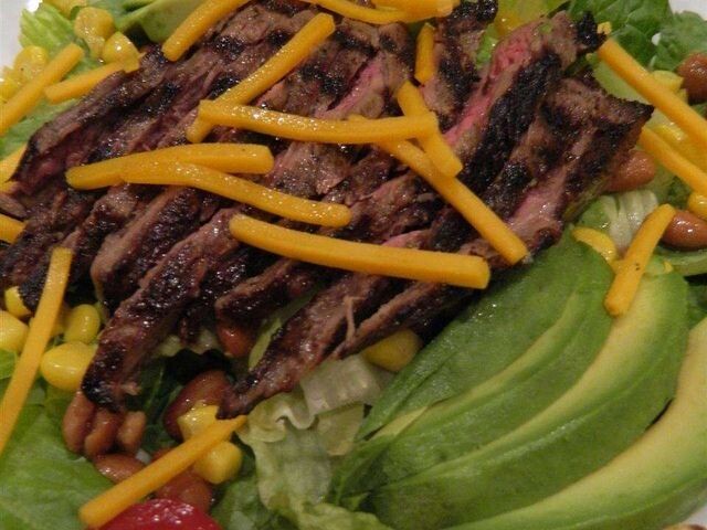 Салат "Фахита" из говядины Это отличный салат для основного блюда в летнее время. ... ⌛ Подготовка: 15 мин. ⏰ Приготовление: 2 час. 40 мин. 🍴 Количество: 6 порций Ингредиенты ✅ 1 (250 гр) бутылка итальянской салатной заправки ✅ 1 чайная ложка молотого кумина ✅ 1 тире острого перечного соуса ✅ ¼ кг стейка, нарезанного полосками ✅ ½ чашки свежих кукурузных зерен ✅ ½ чашки почечной фасоли, приготовленной ✅ ½ чашки тонко нарезанного красного лука ✅ ½ чашки измельченного сыра Чеддер ✅ 1 помидор, нарезанный ✅ 8 чашек смешанной салатной зелени ✅ 2 чашки измельченных чипсов тортилья. Инструкция приготовления 1. Соедините кумин, острый перечный соус и итальянскую заправку в небольшой миске и хорошо перемешайте. Оставьте 1/2 чашки заправки. В отдельную миску добавьте столько заправки, чтобы покрыть говядину, и оставьте мариноваться на 1 час. 2. На раскаленной сковороде обжарьте говядину и готовьте до готовности. Дайте говядине остыть. В миске среднего размера соедините говядину с ку
