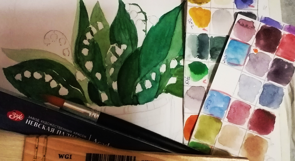 А на прошлом занятии мы рисовали ландыши... Я, конечно, не успела за 2 часа закончить картину, но фотка букета осталась, и я попробую позже вернуться к этому этюду