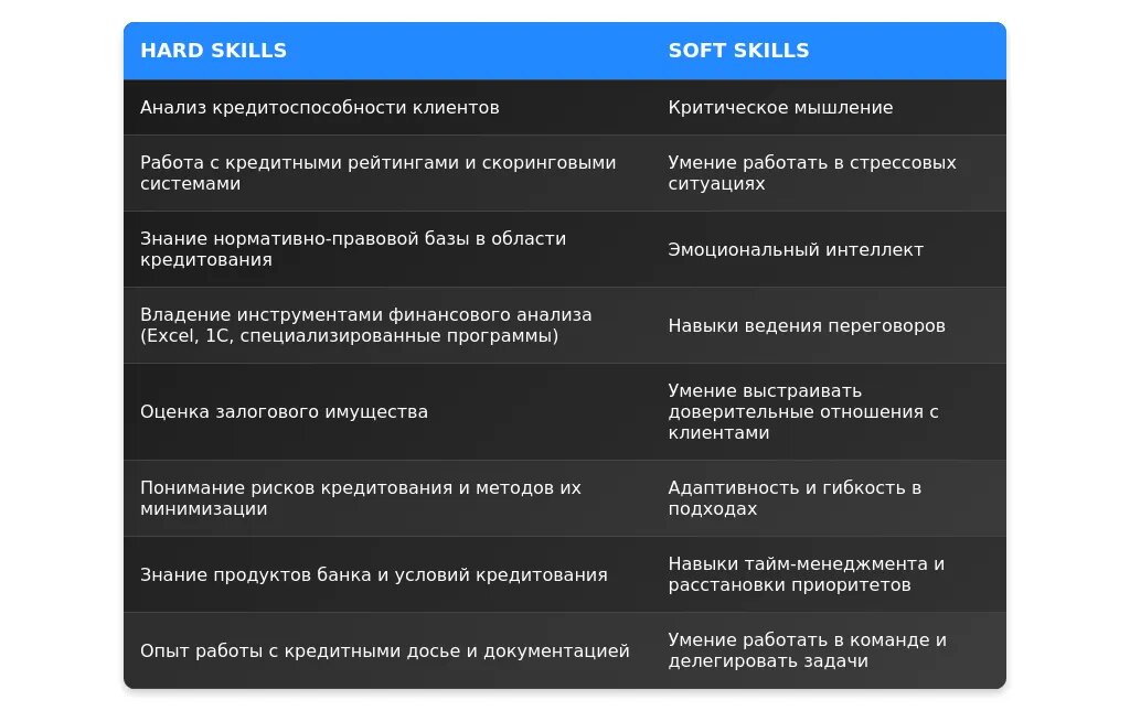 После адаптации: "Анализ кредитных рисков, работа с кредитным портфелем, знание законодательства в области кредитования."