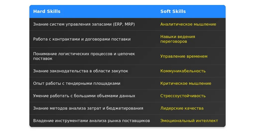 Пример 2: "Поиск и оценка новых поставщиков" подразумевает навыки аналитики и переговоров.