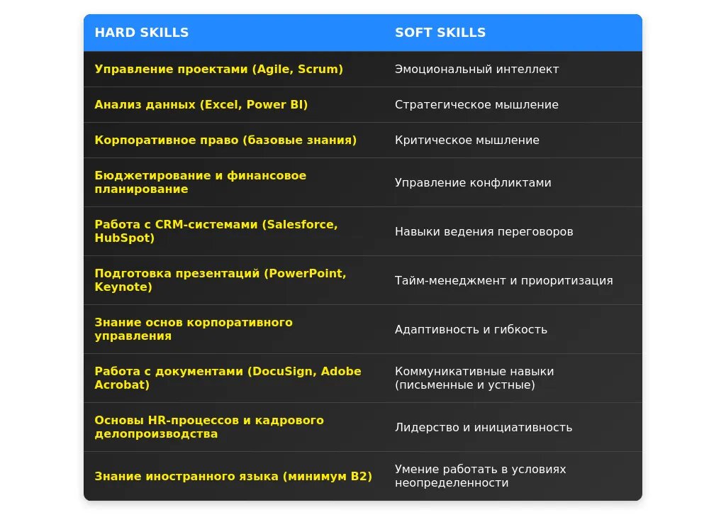 - Делайте акцент на базовые навыки: организация встреч, работа с документами.