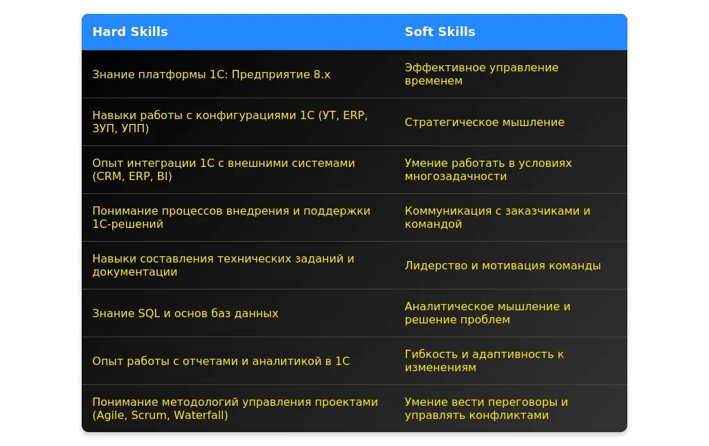 Для менеджера проектов 1С важно владеть следующими hard skills: