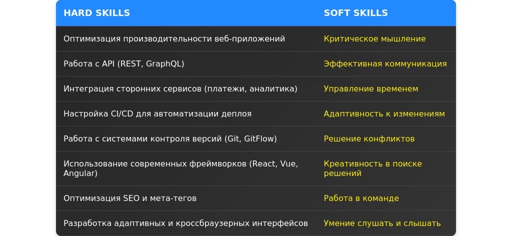 Выделите навыки, которые наиболее важны для вашей целевой позиции. Например, для фронтенд-разработчика ключевыми будут React и JavaScript.