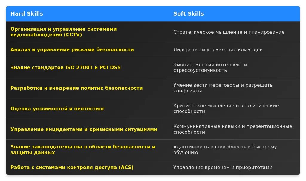 Пример 3: "Владею навыками работы с системами видеонаблюдения и контроля доступа. Прошел курсы по кризисному управлению и основам физической безопасности. Ценю дисциплину и четкость в работе."