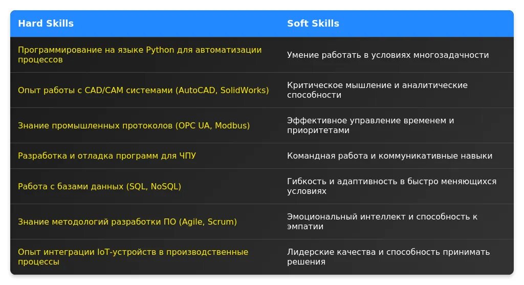 После адаптации: Python, SQL, CAD системы (AutoCAD, SolidWorks), управление CNC станками, оптимизация производственных процессов.