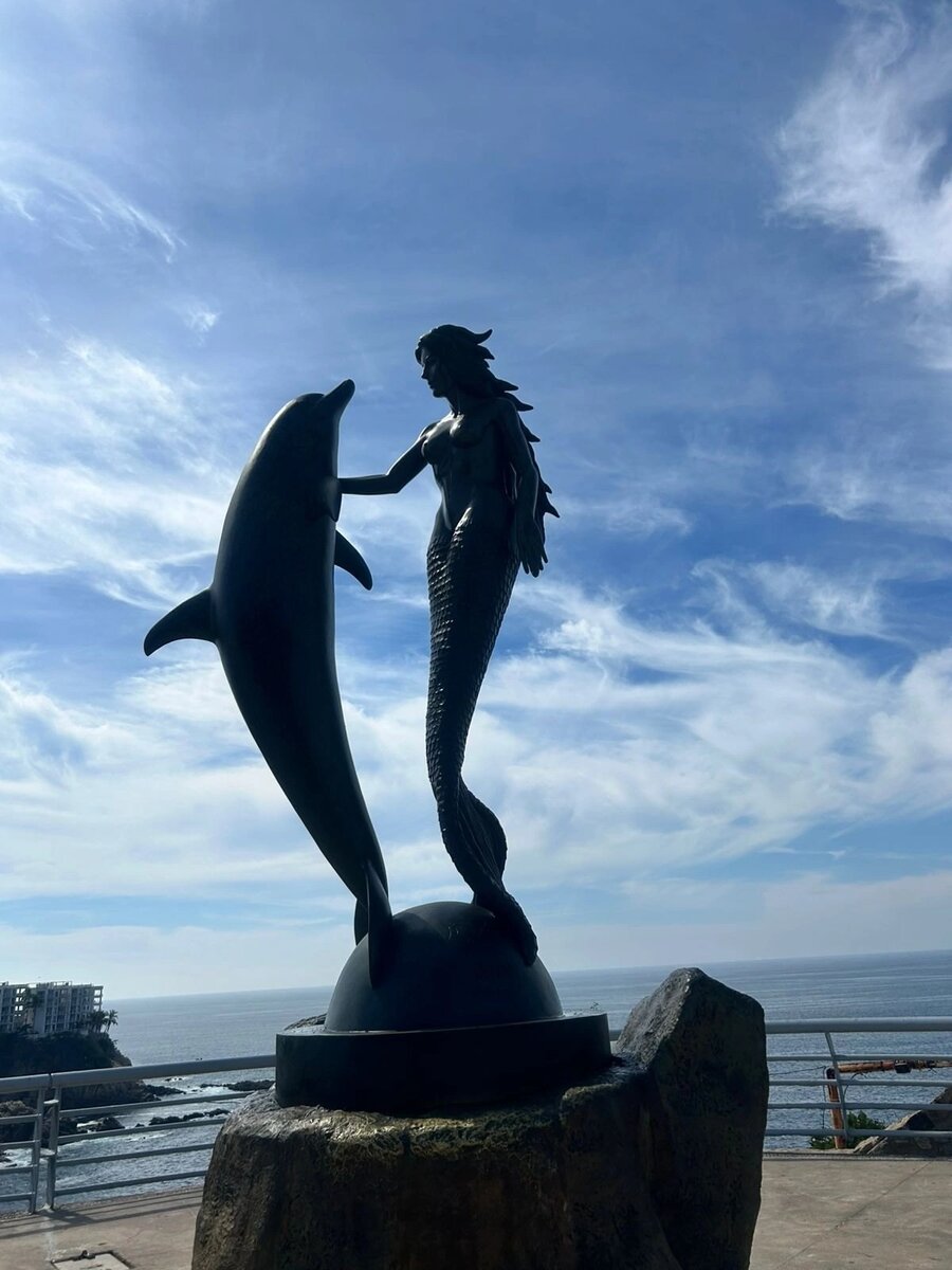 Мы расположились под зонтиками, прямо на песчаном пляже, очень симпатичное местечко! По дороге остановились, чтобы сделать обзорные прощальные фото. Представляете амфитеатр, люди смотрят на море, а на сцене выступает певец. Думаю, это потрясающее зрелище, но когда мы там были, концерта не было, а рядом скульптура русалочка с дельфином, смотрят друг на друга, красиво.