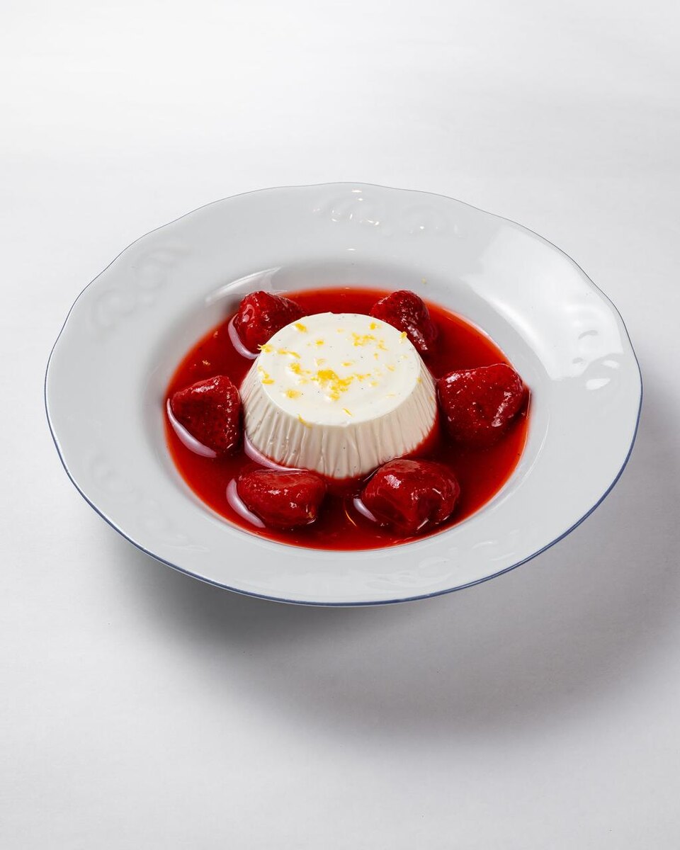 Панна-котта, собранная на контрасте: кремовая мягкость и сочная кислинка. Клубника здесь не добавка, а финальный штрих, который завершает десерт с ясной интонацией.