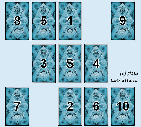 Как завоевать партнера? Избегаем ошибок изначально. Сразу берем партнера "в оборот" :) (создавалось дуплетом с раскладом "ПЕРСПЕКТИВА") S. Сигнификатор. Какой он в личной жизни - ревность, истеричность, скандальность, комплексы. 1. Какой образ у него уже сложился о вас. 2. В чем выражено препятствие в построении отношений. 3. Шаг назад. Остережение: что не терпит в женщине, возможные ошибки в построении отношений, оттолкнет. 4. Шаг вперед. Что вас соединило, место пересечения и взаимного интереса, которым можно пользоваться. 5. Совет. Действие, бездействие? Предложить свидание или игнор? Какой ресурс сейчас на вашей стороне. 6. Потенциальный итог. Какая стихия поможет соблазнить. 7. Соблазнение Дамы Воды. Насколько ему важны ваша душевность, духовность, нежность, ласка, пассивность, ожидание. 8. Соблазнение Дамы Огня. Насколько ему важны секс, соблазн, страсть, активность. 9. Соблазнение Дамы Воздуха. Насколько ему важны интеллект, партнерство, совет, поддержка. 10. Соблазнение Дамы Зе