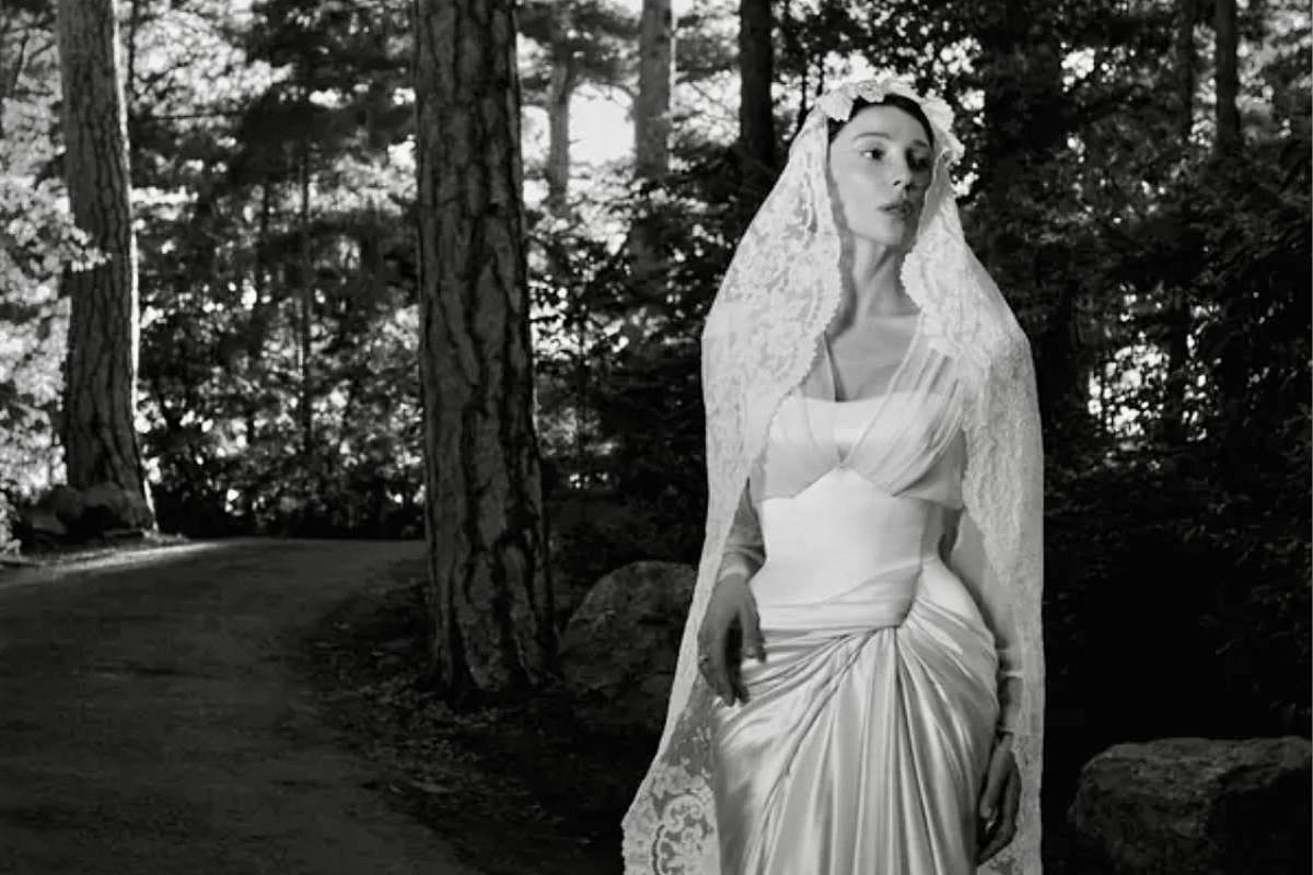 в элегантном платье с корсетом, кружевной фатой и почти старомодной позой невесты, а он — в белом смокинге с чёрной