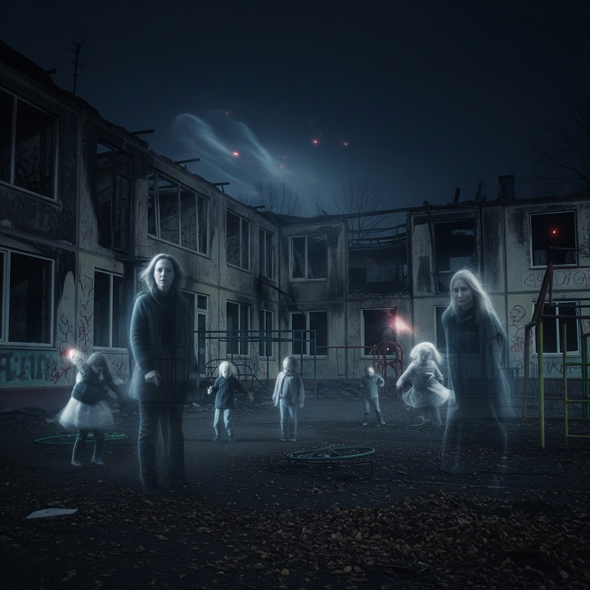 Колокольчик привел меня к тому месту, где когда-то, видимо, была игровая комната или спальня. Среди обломков и мусора я увидел ее. Точнее, ее призрак. Высокая, стройная фигура женщины в простом синем платье, почти прозрачная, она стояла спиной ко мне и тихо напевала колыбельную. Ту самую, из моих снов. Вокруг нее, словно мотыльки на огонь, вились еще более прозрачные, едва различимые фигурки детей. Они что-то шептали, тянули к ней свои ручки.