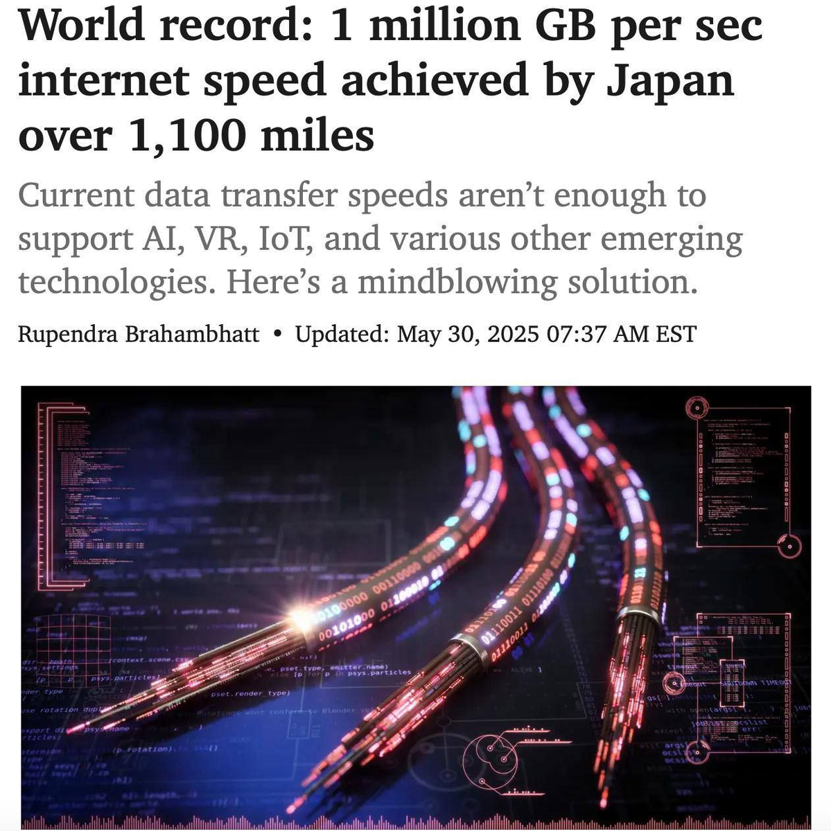 Что произошло? Японские инженеры (включая специалистов из NICT – Национального института информационных и коммуникационных технологий) достигли безумной скорости передачи данных – 1,02 Петабит/сек (1 млн гигабит/сек). Это в 100 000 раз быстрее, чем стандартный гигабитный интернет. Как им это удалось? - 19-ядерное оптоволокно – вместо стандартного одного ядра использовали 19 отдельных световых каналов в одном кабеле. - Оптимизация лазеров и приёмников – сигнал передаётся без потерь на большие расстояния. - Экспериментальные технологии – пока это лабораторный тест, но в будущем может лечь в основу нового интернета. Зачем такие скорости? 1. Нейросети и ИИ – мгновенная обработка гигантских массивов данных. 2. Метавселенные и VR – реалистичные многопользовательские миры без лагов. 3. Наука и медицина – передача данных с телескопов, томографов и ускорителей частиц в реальном времени. Когда ждать в реальной жизни? - Пока технология слишком дорогая для массового внедрения. - Но уже через 5–10