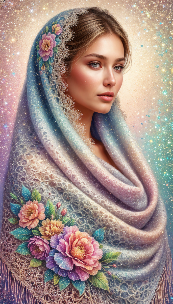 Промт: Нарисуй 9:16: Дива по пояс и оренбургский пуховый платок с традиционным орнаментом, выполненный в технике батик. Цветочная композиция, вдохновленная стилем Ли Богл, с акцентом на легкий радужный гранж. Детализированный рендеринг с использованием пуантилизма для создания текстуры пуха. Добавить мерцающий эффект глиттера, чтобы подчеркнуть воздушность и нежность платка. Палитра: мягкие пастельные тона с переливами радужных оттенков P.S. Приглашение на Мастер-Классы по изучению Топовых Нейросетей, где Вас ждут Бонусы и Подарки: <<<Участвовать Бесплатно>>>