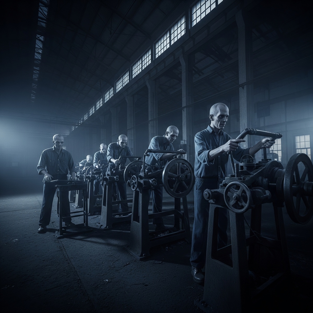 Сначала это было мимолетно, на периферии зрения. Темная фигура в дальнем конце цеха, склонившаяся над каким-то станком. Я списывал на игру света и тени, на усталость. Но фигура появлялась снова и снова, каждую ночь, примерно в одно и то же время. Всегда в одном и том же старом, синем рабочем комбинезоне – спецовке, какие носили здесь еще в советские времена.