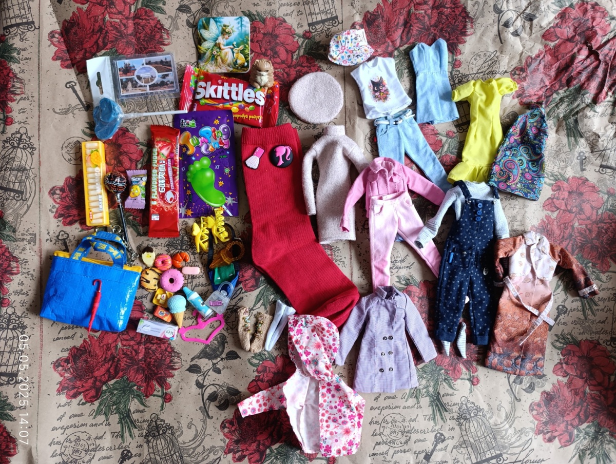 А вот такой румбокс подарила я в свою очередь. И вот пришла пора распаковки. В этот раз почта не подкинула нам сюрпризов (потому что отправляли не почтой, ахаха) и посылка дошла ко мне быстро и та что должна была. по моей просьбе автор добавила несколько кофточек сюрпризом А сам подарок был надежно запакован в коробку. Конечно же внутри сладости. И милая открытка. Куча мелочей для кукол в отдельной коробочке. Носки, они были темой обмена. И кукольный вариант. И, конечно, сама одежда. Мне больше всего в этом наборе приглянулись плащи, джинсы и розовый комплект. Ну и конечно, если написано, что набор на стандартную барби, я натяну вещи на кого угодно, кроме стандартных. Все хорошо село, разве что плащ на свитер высокой получился тесноват. Но у нее и бедра и плечи похоже шир