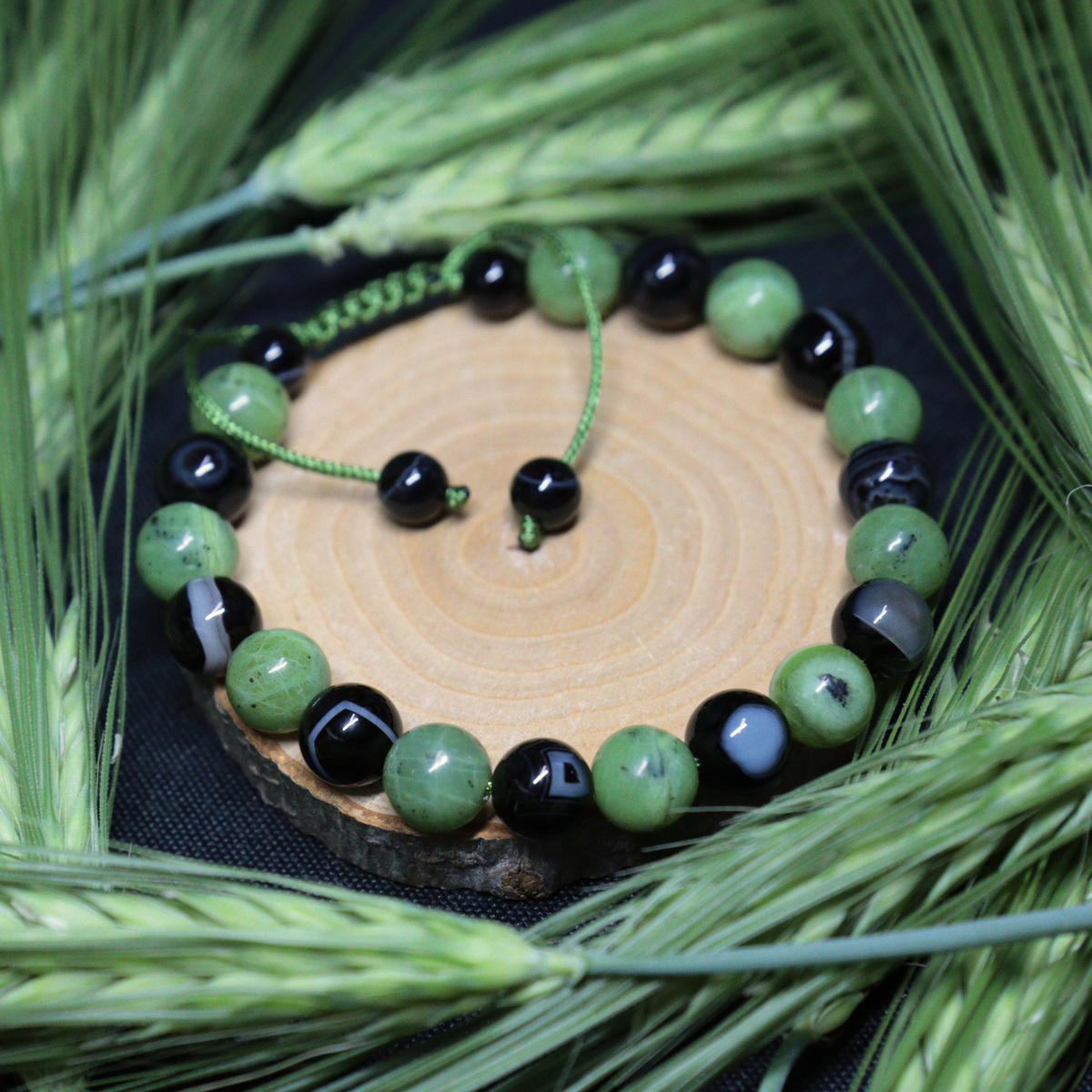 Браслет "Сумрачная зелень" из канадского нефрита и черного агата