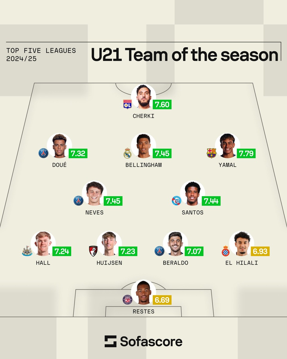 Статистические порталы подводят итоги сезона-2024/25, составляя символические сборные кампании. Споров не избежать, ведь слишком много игроков ярко проявили себя в минувшем сезоне. Эксперты Sofascore сузили выборку и составили команду из футболистов до 21 года, выбирали из игроков, выступающих в топ-5 лиг Европы. Наибольшее представительство у молодежи «ПСЖ»: Дезире Дуэ, Жоау Невеш и Лукас Бералдо. Главные звезды команды отвечают за чемпионат Испании – Джуд Беллингем («Мадрид») и Ламин Ямаль («Барселона»). В Ла Лигу скоро переберется и Дин Хейсен, пока представляющий «Борнмут». В сборную также попали Райан Шерки («Лион»), Андрей Сантос («Страсбур»), Льюис Холл («Ньюкасл»), Омар Эль-Хилали («Эспаньол») и вратарь «Тулузы» Гийом Рест. Сборная сезона-2024/25 из футболистов U21 Справедливый выбор? Команда сезона от Score90. Фанаты негодуют – не нашли Салаха и еще нескольких звезд 😡 CIES составил список самых влиятельных игроков по позициям. Так выглядит топ-10 в каждой номинации 🎥 Игроков
