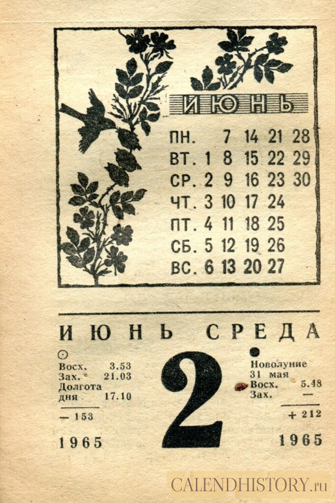 Итак, сегодня 2-го июня и у нас на календаре 1965-й год. Перед нами листок советского календаря для женщин. На календаре у нас среда - 2 июня 1965-го года. *** Оборотную сторону листка этого календаря можно посмотреть у нас по ссылке на сайте. Заходите на наш интересный сайт об отрывных календарях. Другие листки советских календарей смотрите у нас на сайте - CALENDHISTORY.ru ПОСМОТРИТЕ ЕЩЁ ЛИСТКИ ОТРЫВНЫХ КАЛЕНДАРЕЙ: