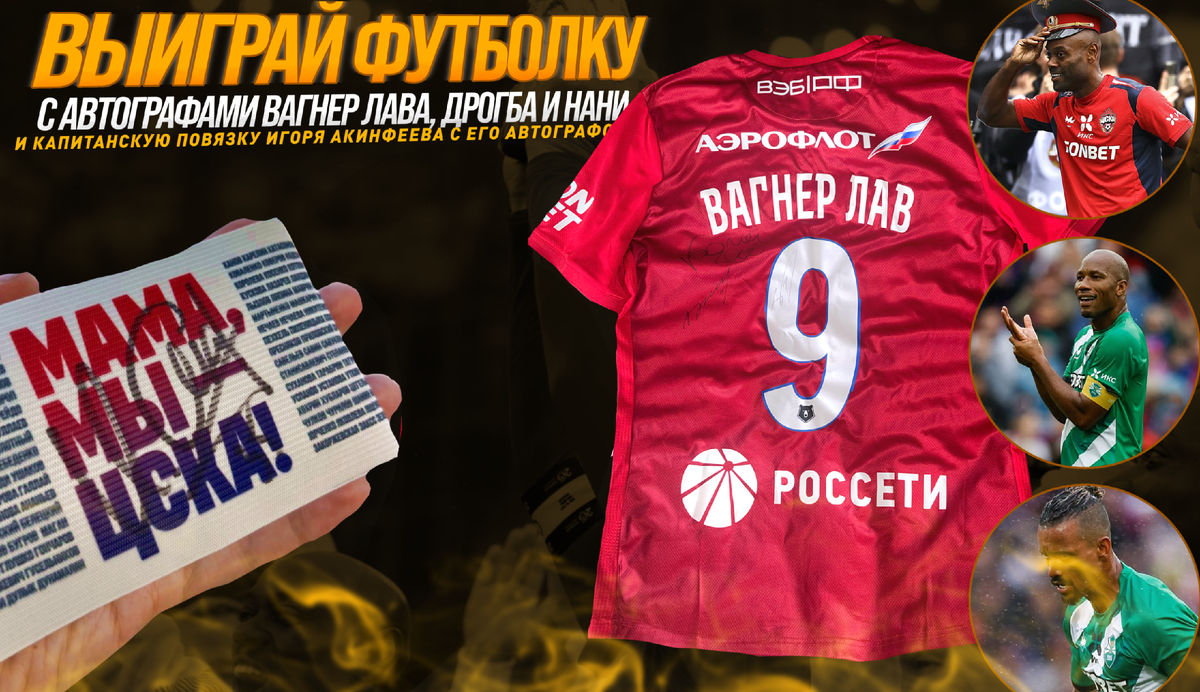 Дорогие друзья и поклонники футбольного клуба ЦСКА! У нас для вас невероятная новость, которая не оставит равнодушными ни одного истинного фаната команды. Мы запускаем уникальный розыгрыш, в котором вы сможете стать обладателем эксклюзивных призов: футболки с автографами легендарных игроков Вагнера Лава, Луиша Нани и Дидье Дрогба, а также капитанской повязки Игоря Акинфеева с его личным автографом!
