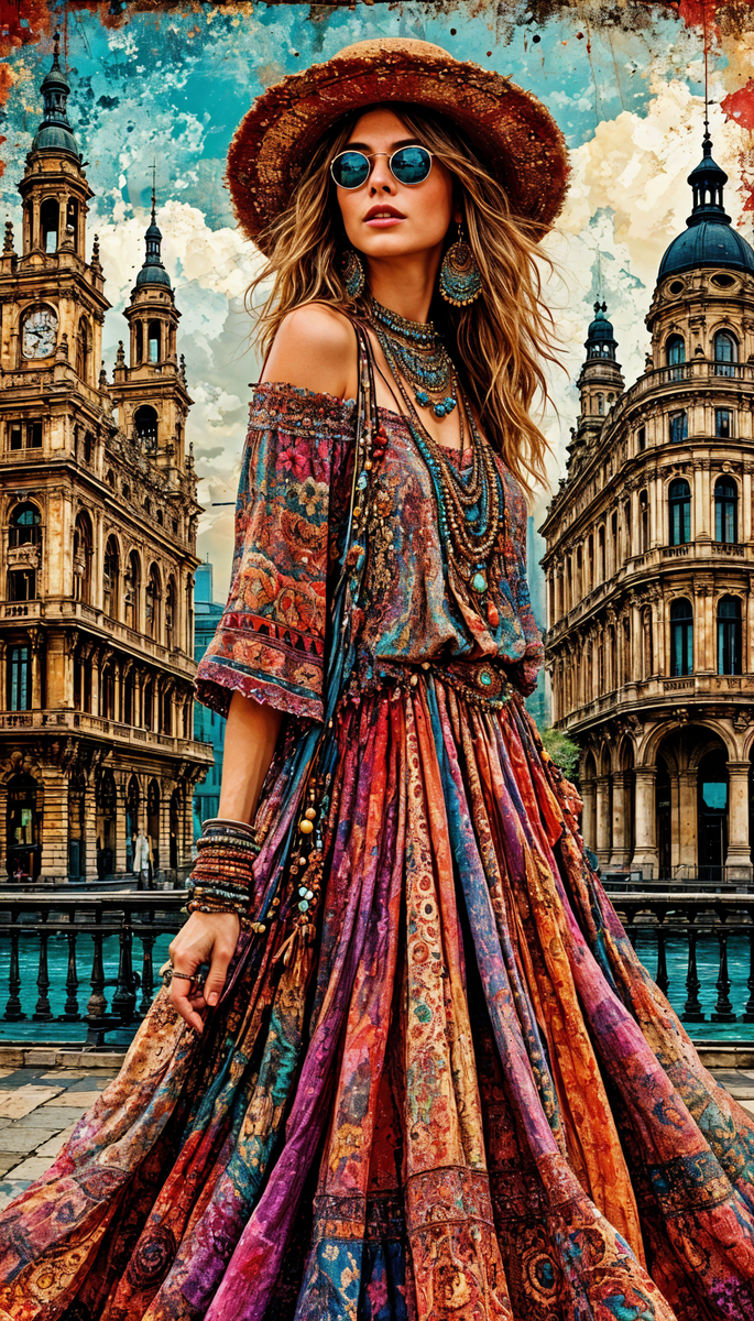 Промт: Нарисуй 9:16: художественный шедевр женщины в богемном платье и аксессуарах на фоне богемных городских достопримечательностей с экстремальными текстурами и деталями, выполненными с высокой детализацией и стилистикой, 3d P.S. Приглашение на Мастер-Классы по изучению Топовых Нейросетей, где Вас ждут Бонусы и Подарки: <<<Участвовать Бесплатно>>>