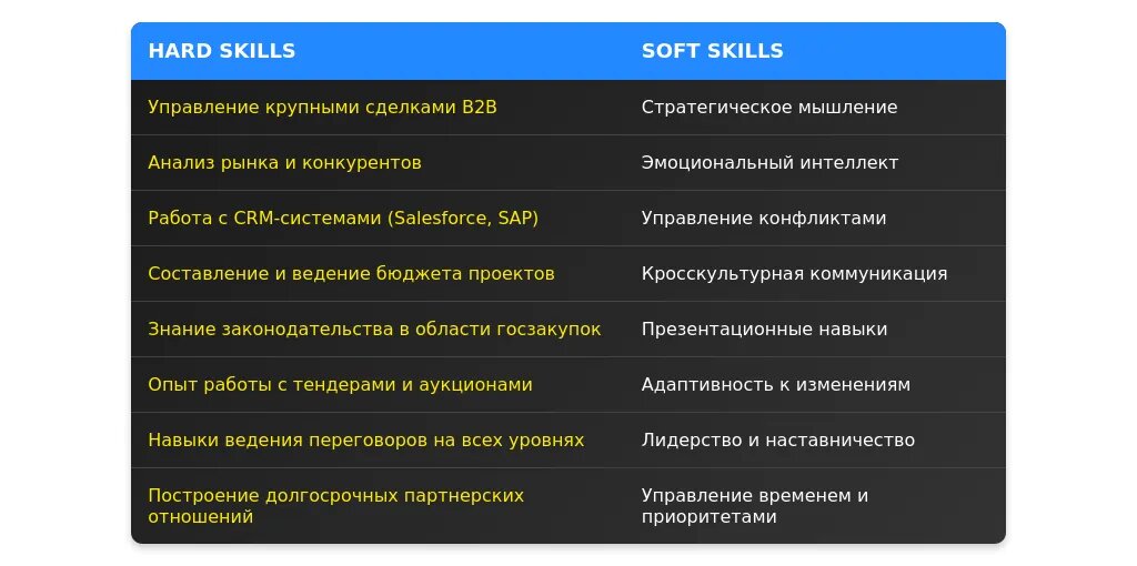 После адаптации: "Опыт работы с федеральными клиентами, ведение переговоров, использование CRM-систем (Salesforce, 1С), навыки аналитики."