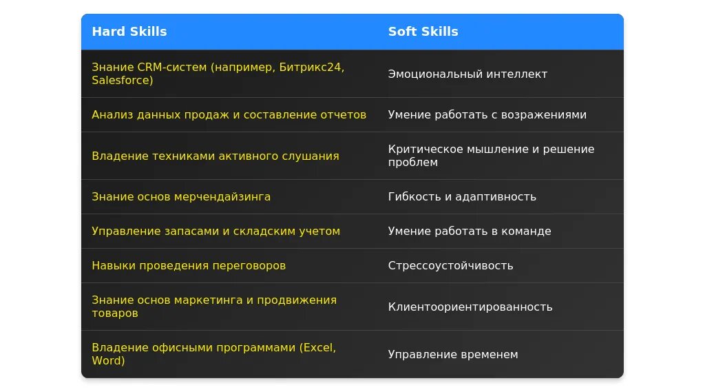 - Навыки коммуникации: "Умение находить общий язык с клиентами".