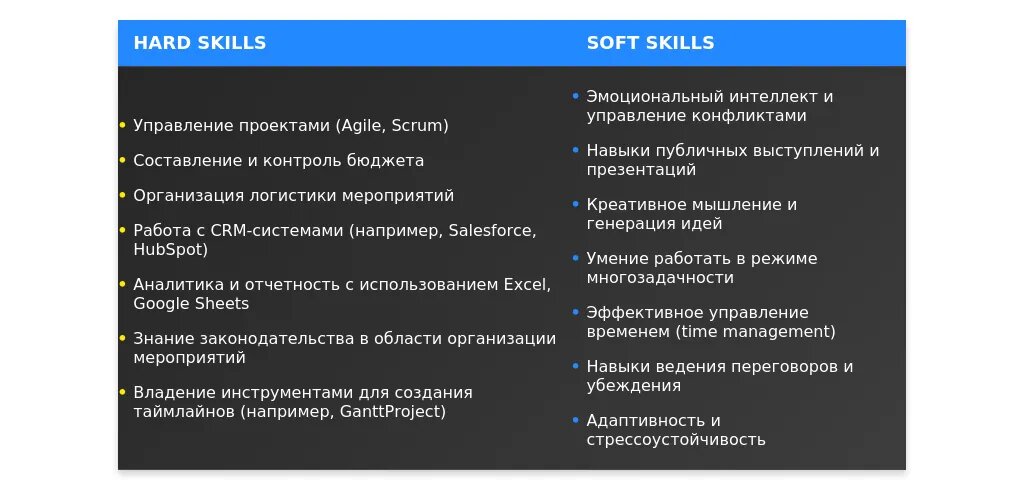 Пример 2: "Организация корпоративных мероприятий". Обязательное требование — опыт в организации мероприятий, а скрытое — креативность и умение работать в команде.