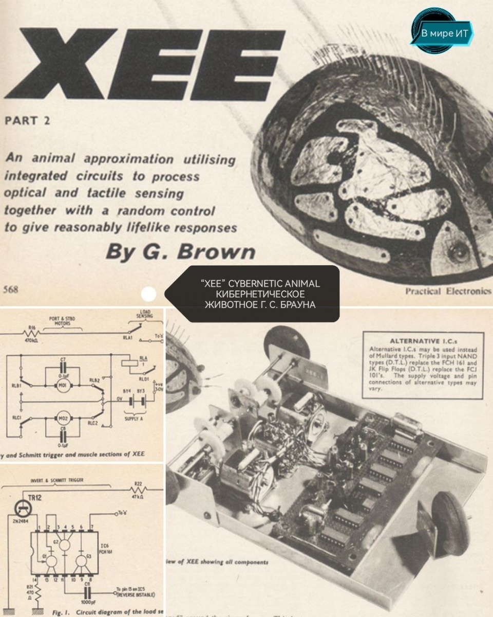 “XEE”, кибернетическое животное британского учёного Г. С. Брауна (G. C. Brown), 1971 год. Робот стал одним из первых автономных машин, способных самостоятельно ориентироваться в пространстве и принимать решения на основе сенсорных данных.