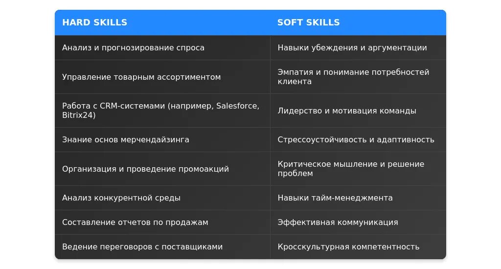 После адаптации: "Знание CRM-систем, анализ KPIs, управление командой, работа с крупными ритейлерами."