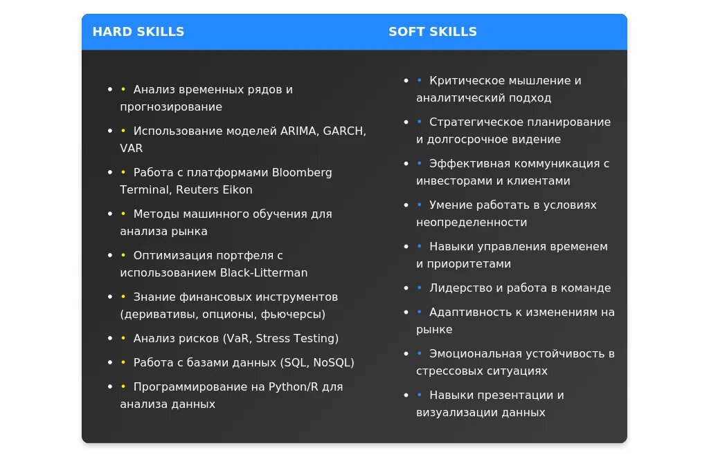 Навыки должны быть перегруппированы под требования вакансии. Выделите ключевые компетенции, такие как знание аналитических инструментов (Bloomberg Terminal, Excel), языков программирования (Python, R) или сертификации (CFA, FRM).