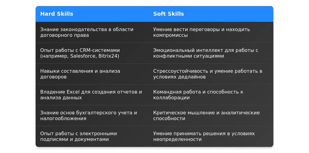 ✅ Пример 2: "Коммуникабельность: эффективное взаимодействие с юристами и клиентами для согласования условий договоров."