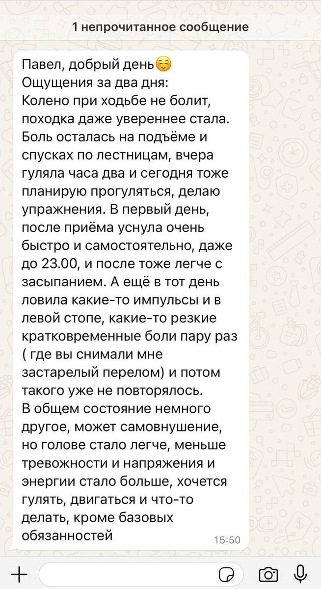 Описание состояния на следующий день после работы с коленом👆 Краткий отзыв: боли в движении нет, осталась только при движении по лестнице, легкость в засыпании (были с этом проблемы), стало больше энергии, желания что-то делать, легкость в теле🙏 Работал методом функциональной неврологии + УДМ на коленный сустав💪