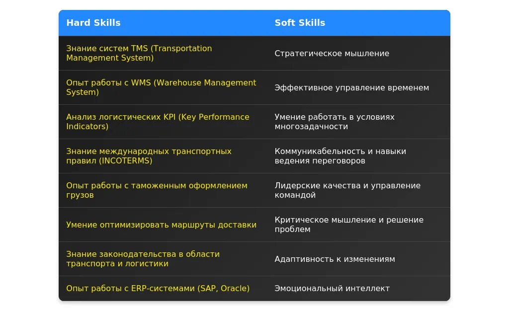 - Ключевые навыки, связанные с логистикой и транспортом.