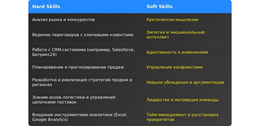 После адаптации: "Опыт работы в региональных продажах, знание специфики рынка, навыки ведения переговоров."