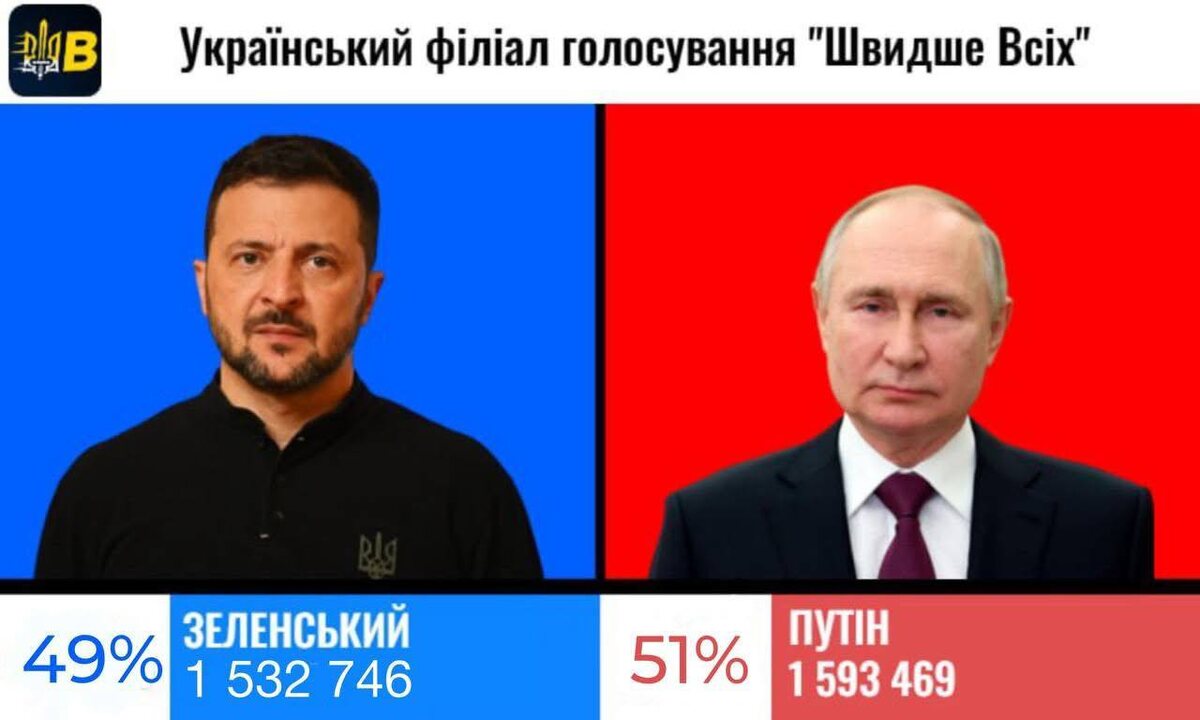 Трамп запустил голосование на Всемирной платформе Faster Anyone, а для украинцев – на платформе филиала компании в Украине «Быстрее всех». Кого вы поддерживаете? Результаты голосования на Украине: Владимира Владимировича Путина – 1 593 469 Владимира Владимировича Зеленского - 1 532 746